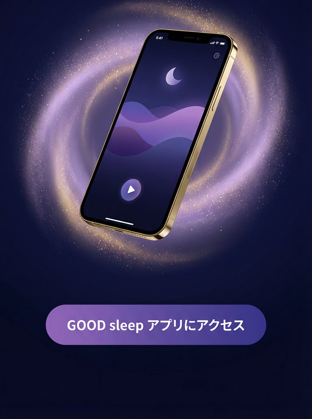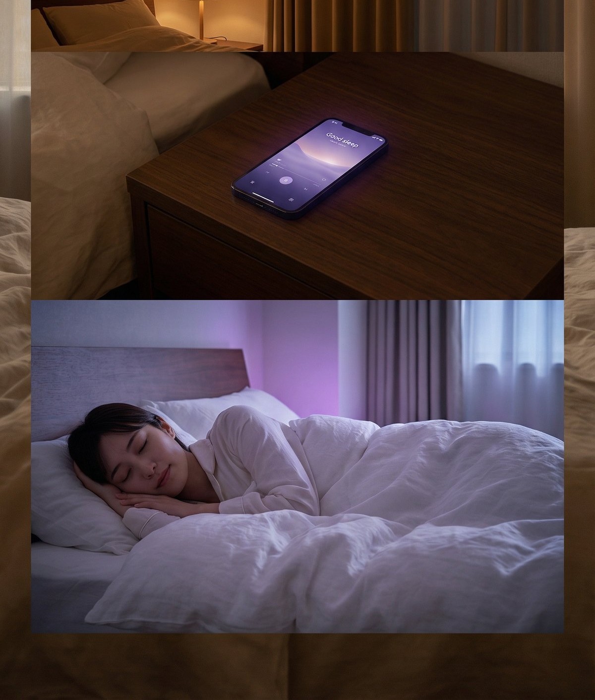 プロのサウンドデザイナーが手がけた楽曲は、 入眠から深い睡眠まで計算し尽くされた音の設計図。 聴くだけで、眠りの深さが変わります。